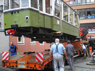 Der Beiwagen 40 der Reutlinger Straßenbahn, der einige Zeit lang an der Marienkirche ein neues Domizil gefunden hatte, kehrte heute wieder in seine Heimat Pfullingen zurück. Um 8.00 Uhr wurde er verladen und auf den Marktplatz in Pfullingen transportiert. Auch dort wird er einige Wochen als Bistro dienen, ehe es dann wieder zum Brauchtumsverein in den Farrenstall zurück geht.