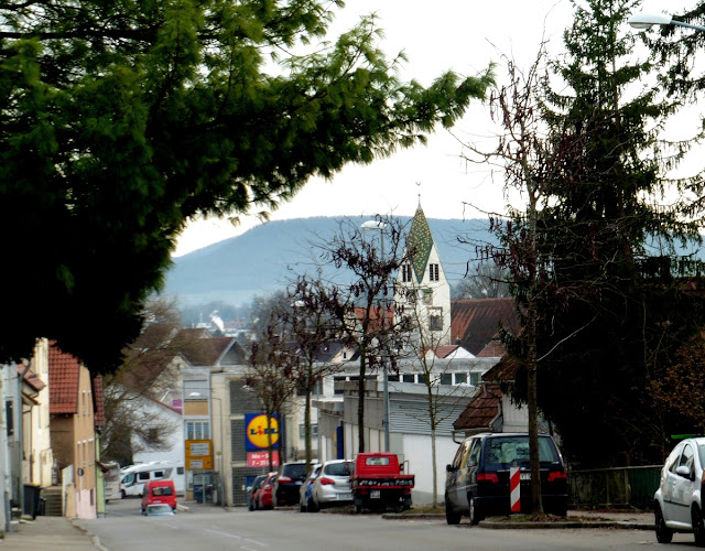 Die Kirchturmspitze der Betzinger Mauritiuskirche vom LIDL Parkplatz aus gesehen wie sie aus den Häusern am "Flaschenhals" der Echaz herausragt.